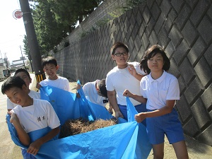 先日の台風で、学校の松の木からたくさんの松葉が歩道に落ちました。