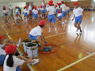 児童会種目は、今年は全校で「玉入れ」をします。青玉を入れると、点数が2点入りますが、青球を投げられるのは1・2年生だけです。それぞれのチームで作戦を立てて、青球を高学年が拾って低学年に渡すなど、工夫していました。本番はどちらが勝つのでしょうか。楽しみです。