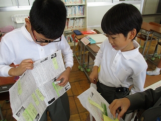 今日は、3年2組の朝学習の様子を教員全員で参観しました。この日の朝学習は、読む力を付けるために全校で取り組んでいる学習、通称「読みチャレ」(読む力を付けることにチャレンジ)です。本校もそうですが内灘町の子ども達は、文章を「読む力」がやや弱いそうです。そこで、始めたのが週2回の「読みチャレ」。題材は、子ども向けの新聞記事なので、読む力が付くだけでなくいろいろな話題に触れるよい機会にもなっています。