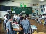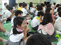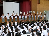 教頭先生が戦争のことや原子爆弾のことなどを交えながら折り鶴の歌詞を話してくれました。子どもたちは一生懸命に話を聞いて、そのあとに音楽委員会の演奏の下、全員で合唱しました。