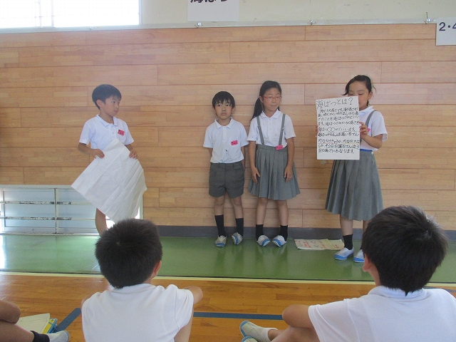 今日は今まで総合的な学習の時間に、内灘町の事について調べたりまとめたりしたことを、学年全体で発表しました。