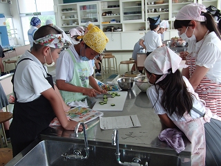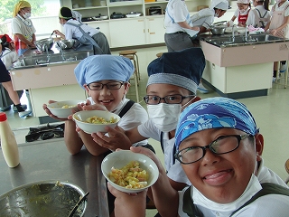 この日は調理実習。ゆで野菜サラダを作りました。「野菜をゆでて作る」という事で、ポテトサラダにチャレンジするグループもありました。調味料を合わせながら、ドレッシング作りにいそしむ男子の姿も印象的でした。みんなの顔は、どの顔を見てもとても楽しそうでした。