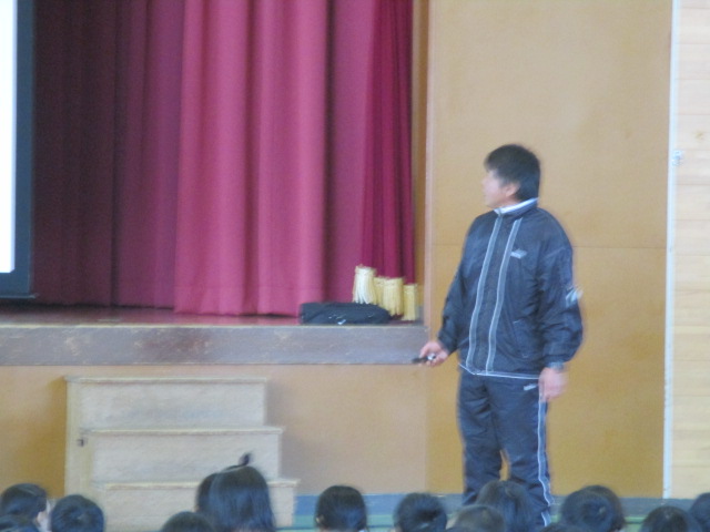 次に生徒指導の先生から、生活目標についてお話がありました。12月の生活目標は「はげましあってやりきろう」です。それぞれのクラスで、今年中にできるようになったらいいなという目標を考え、みんなで協力して頑張っていきましょう!