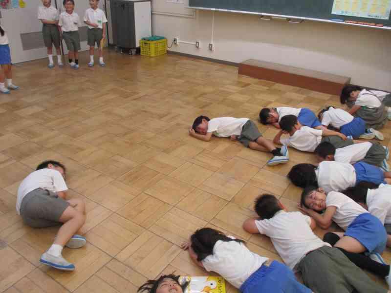 本日シェイクアウトいしかわとして避難訓練を実施いたしました。今回の内容は「地震が発生したのちに、津波警報が発令される」というものでした。教室で机の下に素早く隠れ、身を守るという避難行動をどの児童も落ち着いて行っていました。その後の3階への避難も静かに素早く行うことができました。