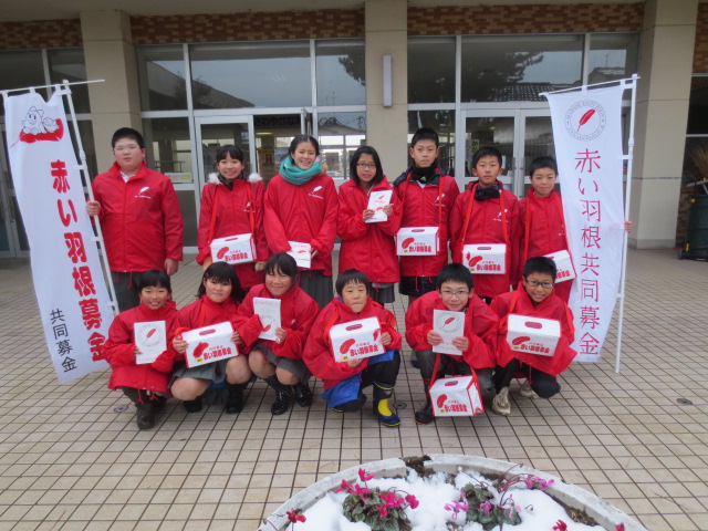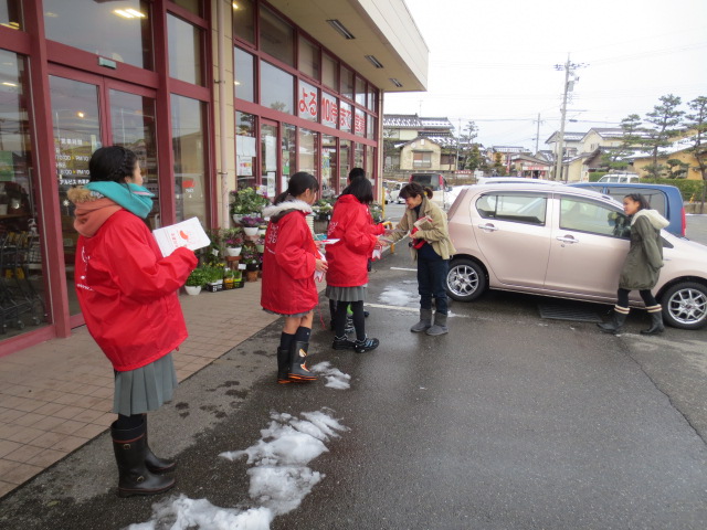12月15日(月)の放課後、内灘町社会福祉協議会の方と一緒に、アルビス前にて「赤い羽根共同募金活動」を行いました。冷たい風が吹き付ける中でしたが、「ご協力お願いします。」「ありがとうございました。」と元気な声で呼びかけたり、お礼を言ったりすることができました。たくさんの方の善意に触れ子ども達も笑顔で活動を終えることができました。本当にいい経験ができました。