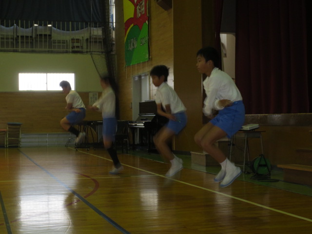 児童集会の様子です。6年2組の国語で学習したことの発表。体育委員会のなわとびの技紹介。健康委員会の健康標語の表彰。ダンスクラブの全校ダンス「妖怪体操第一」。そして音楽委員会の今月の歌「気球に乗ってどこまでも」。全校が一つになり、今月もステキな歌声が体育館中に響き渡りました。