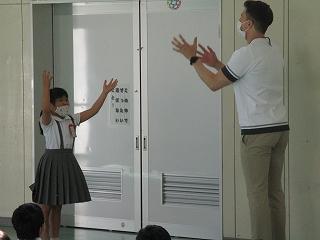 写真は、ケリン先生と1対1で自己紹介している場面です。どの子も「My name is ・・・」と上手に自己紹介をしていました。会話をキャッチし合うということで、ボールを互いにキャッチしながら紹介していました。音楽にのって歩いたり、ジャンプしたりする活動もありとても楽しそうでした。