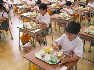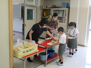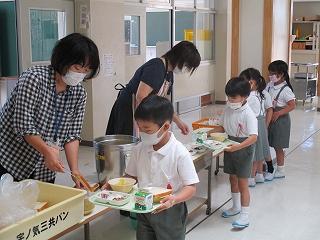 今日は、1年生の給食の様子をお伝えします。コロナ感染予防のため、現在は教員が配膳し、児童がセルフで個々の給食をお盆に受け取っています。例年なら6年生がお手伝いに来るのですが、今はまだ異学年との交流を減らす取組を行っており、担任の先生と支援の先生で準備をしています。この2週間で配膳もすっかり慣れた様子で、どの子も要領よく給食を受け取っていました。