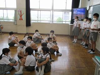 今日は、1年生の英語活動の様子をお伝えします。1年生の英語活動は、町英語指導員のケリンさんと担任で毎月1回行われます。できるだけ密をさけるため、プレイルームで行いました。ケリンさんが1時間ずっと英語で話し続けるので、子供たちはジェスチャー等を見ながら理解し、英語で答えを返しています。