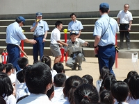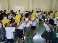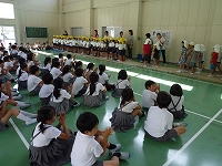今日は、はまなす保育園、大根布保育園、白帆台保育園の年長さんが1年生と交流をしました。はまなす保育園の子どもたちは、暑い中、25分ほどかけて「入学したら歩かなければならないのですから・・・」と保育士さんと汗だくになって歩いて来ました。白帆台保育園の子どもたちは小学生が乗るスクールバスでやってきました。いつも保育園から眺めているバスに今日は乗ることができて喜んでいたそうです。