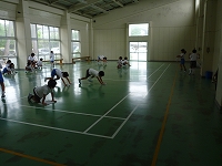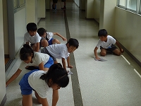 掃除の時間です。職員室前や1階特別教室前の長い長い廊下を3年生が写真のような拭き方でぞうきんがけをしています。体育館では5年生がやはり膝をついて、ていねいにぞうきんがけをしていました。右手と左手の使い方が絶妙です。