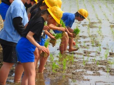 本日、川辺俊一様にご協力をいただき、田植え体験を行いました。子どもたちは初めての田んぼに苗を植えるという体験に、最初は難しさや素足で田んぼに入ることに抵抗感を感じていた子もいましたが、声を掛け合いながら活動に取り組み、最後は笑顔で体験を終えていました。体験を通して、田植えの大変さや難しさを実感しているようでした。