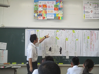 今日は、5年2組の国語の授業を参観しました。担任は、今年度4月に大根布小学校に赴任したうね林先生です。6年目の若手の先生ですが学級経営がしっかりしており、赴任して早々に子ども達とのよい関係を築きあげました。5年生はとてもエネルギッシュな学年で、何をしても勢いを感じます。うね林先生はそのエネルギーがよい方向に向かうように、うまく導いてくれています。