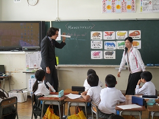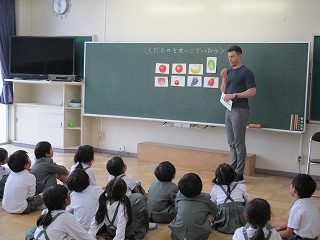 後期に入り、1年生もすっかり学校に慣れて、毎日元気に学習に取り組んでいます。今日は、1の1の英語活動の授業を参観しました。1年生は、ほぼ月に1回のペースで、英語指導員のケリン・バウリング先生と英語活動に取り組んでいます。1年生なので、まだまだ活動が中心ですが、ケリン先生のお手本をまねての発音は、なかなかのものです。