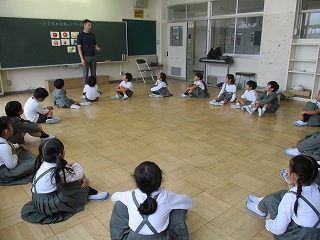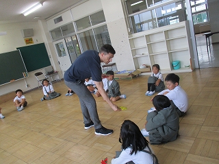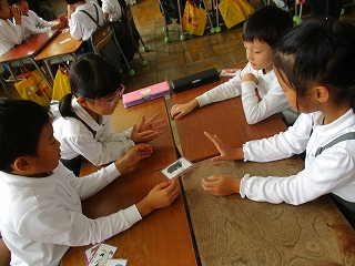 2年生は、月1回程度、町の英語指導員のベンジャミン先生といっしょに英語活動を行っています。今日の授業は、「動物とその色を英語で言う」という活動でした。初めに、「かるたとり」次に「動物の絵が描かれた紙をまるめて中をのぞき、その動物を当てる」という活動を行っていました。どちらも楽しくて楽しくて、いつも元気でパワフルな2年生が、ますますパワーアップして活動に取り組んでいました。教えてくださるベンジャミン先生もにこにこ顔です。教室が笑顔にあふれ、英語で話すことへの抵抗感は全くなくなっていました。