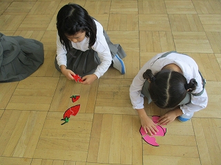 今日は、<くだものをえいごでいおう>という課題で、活動していました。ケリンさんの授業はいつも活動に工夫があって、子ども達はのりのりで声を出し学習しています。今日の活動はくだもののパズルで、「パズルが完成したらケリン先生に英語でくだもののなまえを伝える」というものでした。大好きなパズルがあり、できあがったくだもののなまえを言ったら、ケリン先生にほめてもらえるというシナリオに、どの子もうきうきでした。こうして英語が好きになり、将来大人になった時に、町で外国人に話しかけられても、物おじすることなく会話ができるようになることが、内灘町の英語教育の目標の一つです。
