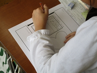 今日の授業は、「色と形を英語で言う」という活動でした。色と形の両方を組み合わせて言うので、どちらも覚えていないとうまく言えません。例えば「Red Square」(赤い四角)「Pink heart」(ピンクのハート型)のように言うのですが、色は英語で言えても形が思い浮かばない子がいて、ローワン先生のお手本に続いて何度も声に出していっしょうけんめい練習していました。先生と会話したり、ペアで聞き合ったりといろいろな活動を通して、初めは言えなかった子もだんだんと言えるようになっていきます。カラフルな色と形は目にも楽しく、外国人の先生との触れ合いも日常の風景になってきたと感じます。