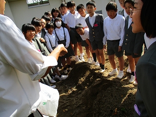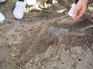 今日の授業は「流れる水のはたらき」で、課題は<流れる場所によって、川や川岸のようすが違うのはどうしてか>でした。子ども達は、川の傾きと流れの強さや速さ、水の量や川幅などに目を付けて、流れる水の3つの働き(しん食・運ぱん・たい積)について、考えていました。理科の授業は、予想して仮説を立て、実験して検証することが多いのですが、川の上流から下流までを実際に目で見て確かめるのは、授業の中では難しいことです。そこで城崎先生は、学校の畑に山を作りじょうろで水を流して、その様子を観察する方法をとりました。おかげで児童は、流れる水の働きがより明確にイメージできたと思います。