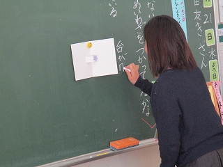 5限目ということで、昼休みにたっぷり外で遊んだ子ども達は額に汗をかきながら、それでも元気いっぱい学習に取り組んでいました。2組は、エネルギッシュな子ども達が多くいつも教室から、ぴんぴんした声が聞こえています。今日も、はながさいてうれしくなったくまさんと、周りの動物達の気持ちを上手に想像してセリフにしていました。黒板の挿絵を使って説明する子もいて、どんどん話す力をつけていることが分かりました。担任の松本先生も若くて元気いっぱいです。先生も子ども達も伸び伸びと成長していってくれることを願っています。