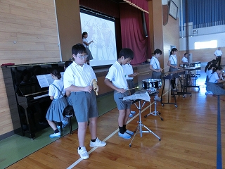 教頭先生が戦争のことや原子爆弾のことなどを交えながら折り鶴の歌詞を話してくれました。子どもたちは一生懸命に話を聞いて、そのあとに音楽委員会の演奏の下、全員で合唱しました。