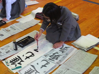 今日は3学期の始業式があり、その後5年生は体育館で書き初め大会を行いました。