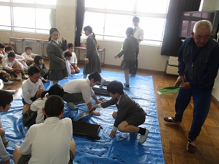 各教室で凧に糸をつけたあとで体育館に移動しました。