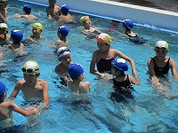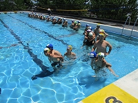 今年度からの取組みのふれあいプール。今日は3年生と5年生のふれあいプールの様子をお伝えします。この日は、3年2組と5年2組が行いました。5年生が3年生に手取り足取り泳ぎ方を教えてあげたり、一緒に波を作って遊んだりしました。