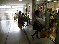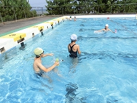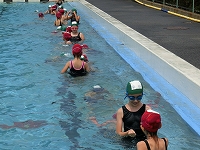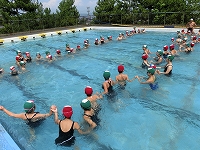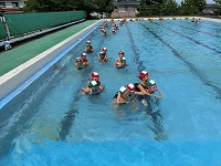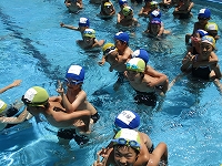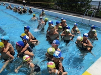 6年生におんぶをしてもらって、最初は「洗濯機」プールをぐるぐる回りました。おんぶされている1年生は気持ちよさそうにしていました。次は1年生が6年生に手を引かれながら自分達で歩いたり、飛び跳ねたり、泳いだりしながら楽しそうに入っていました。