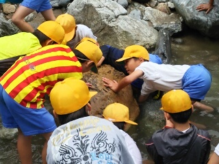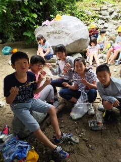 天候にも負けず、子どもたちは川をつきすすみ、次々に岩魚をゲット!79人で83匹の岩魚を捕まえました。はじめはおっかなびっくりだったのに、どんどん自然モードになっていきました。