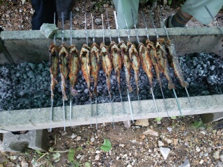 お昼ご飯は、自分でとってさばいた岩魚を食べました。一時間かけてじっくり焼いた岩魚です。頭まで食べられる最高の味でした!