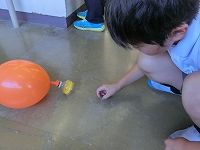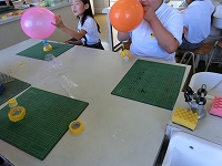 ペットボトルに穴をあけ、風船の中に入った空気の力を使って