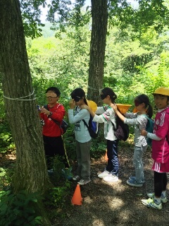 目隠しをしたまま電車ごっこの要領でリーダーのこえを頼りにコースをめぐります。