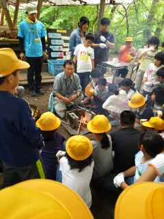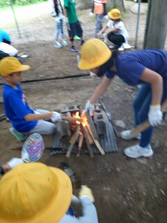 今日の晩ごはんは、自分たちで火を起こし、飯ごうでご飯を炊きます。なかなか火が付かずに悪戦苦闘するグループや、高く上がる炎におどろくグループなど反応は様々。