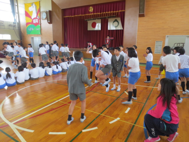 キラキラ活動のジャンケン列車。全校がより仲良くなるように企画をしました。最後まで勝ち残ったのは6年生でした!とても楽しい時間になりましたね!