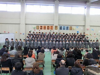 最後は今月の歌です。卒業式にも歌いますが「君に会えて」を音楽委員会の演奏で歌いました。みんな大きな口を開け、本当に元気よく歌うことができましたね。