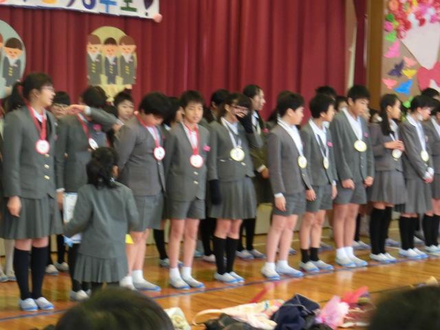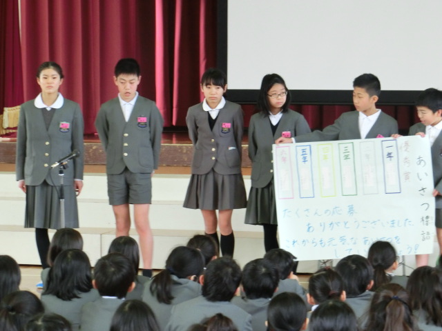 次に、今月の生活目標『感謝の気持ちを伝え合おう』について、生徒指導部の先生からお話がありました。毎日の生活の中で、いろんな方にお世話になっていること、その気持ちをしっかり伝えていきましょうというお話でした。2月27日には「6年生大感謝祭」が行われます。ありがとうでいっぱいの学校にしていけるといいですね。