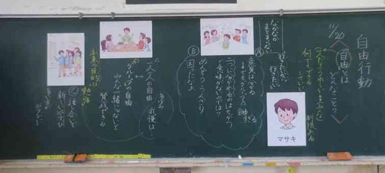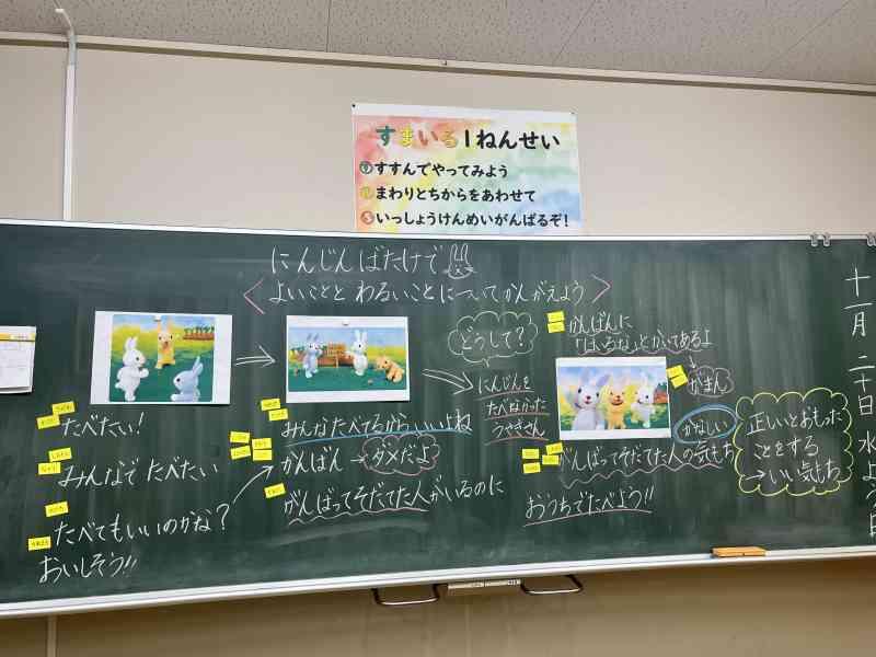 1年生では、「にんじんばたけで」というお話を読み、してはいけないことを「みんながやっているから自分もしてもよい」と考えることの間違いに気づき、よいと思うことを進んで行うことの大切さについて考えました。