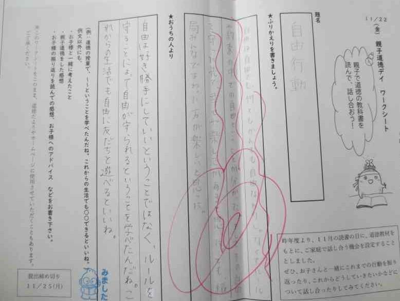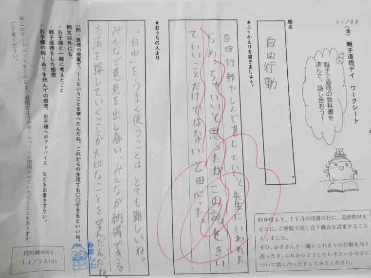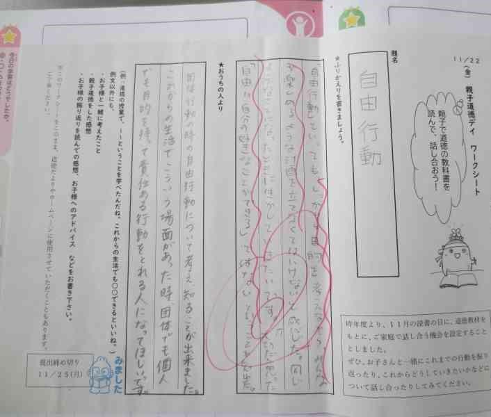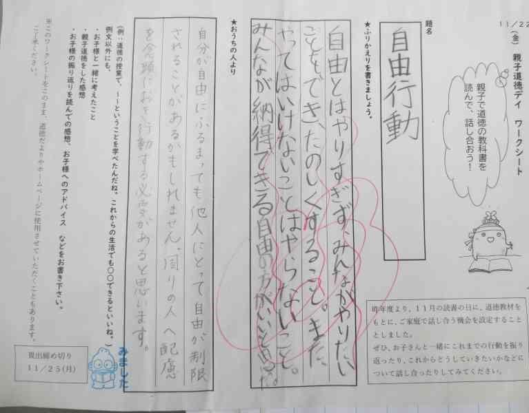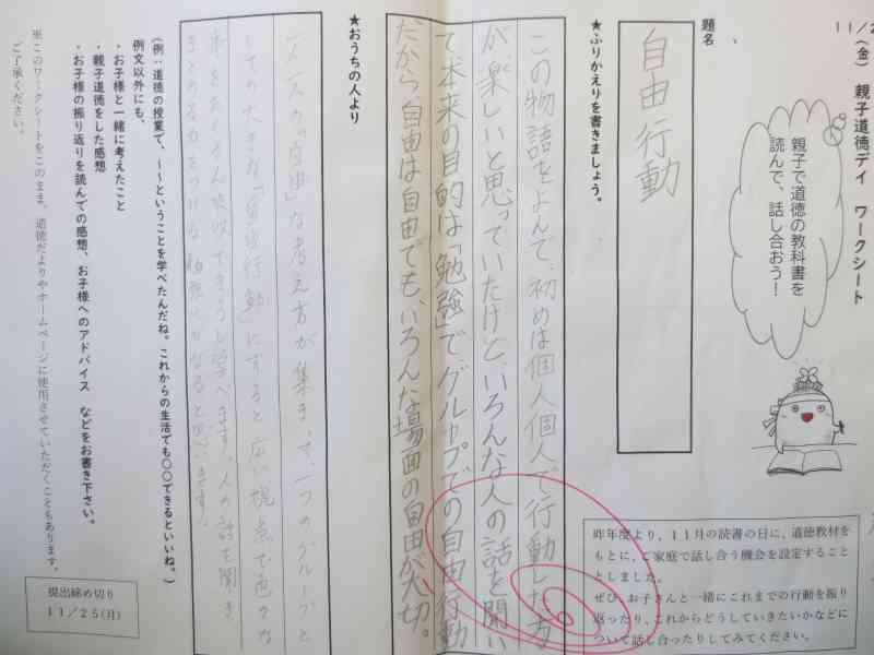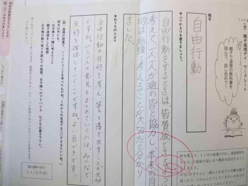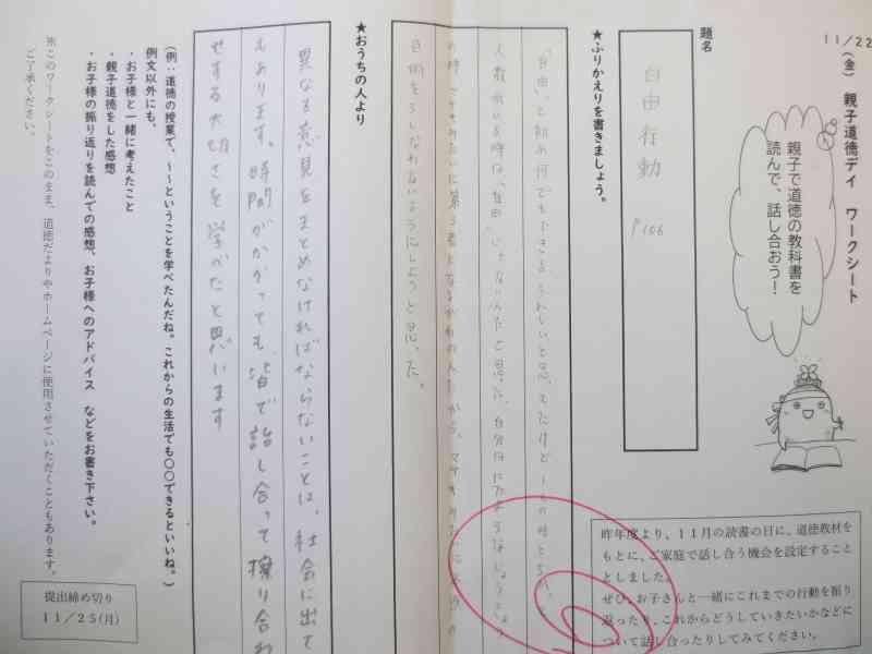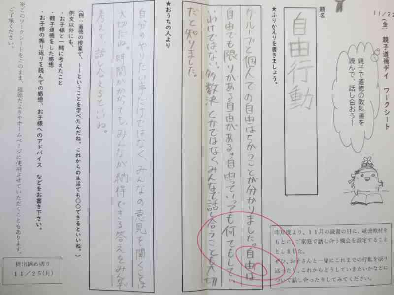 おうちの人と話し合ってみると、友だちと話し合っただけでは出ないような考えをもてたり、自分が考えていることをおうちの人に伝えたりなど、いつもとは違う良い経験ができたのではないかと思います。