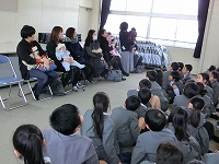 また、赤ちゃんの重さを実感できる人形を一人一人抱っこしました。7人のお母さんたちからも体験談をお聞きすることができ、子どもたちは、生まれる前から愛されて育ってきたことを実感したと思います。授業後、子どもたちからは「お母さんってすごいと思いました。」「お母さんにありがとうと言いたいです。」などの感想がありました。普段は気づけないような、家族の愛情を感じることができましたね。
