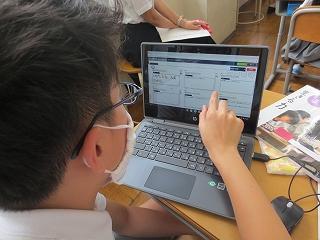 子供たちは、電車の中でおばあさんに席を「譲る」か「譲れない」かという具体場面で、自分の思いをタブレットを使って交流していました。児童の意欲は高く、男女関係なく聞き合っていて、よい学びの集団となっていると感じました。思いはあっても行為にうつせないという心の葛藤はだれにでもあるものです。行為にうつすことの意味を、この詩から子供たちは深く考えていました。