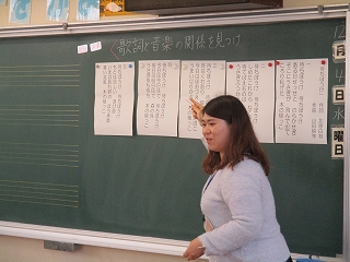 今日は、5年生で「待ちぼうけ」の歌詞と音楽(歌い方)から、情景を想像する授業をしていました。作詞は北原白秋、作曲は山田耕筰で、昔からよく耳にする曲ですが、子ども達には歌詞の内容も、DVDから流れる音楽(歌い方)も耳になじまなかったようで、はじめは、キョトン顔の児童やクスクス笑いの児童もいました。しかし、その反応をすばやくキャッチした中村先生は、「何か面白いところがあったんだね。それはどこ?」と問い、歌詞と歌い方を連動させ、そこから情景を想像するという学習につなげていました。