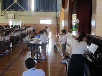 音楽委員会の合奏に合わせて全校で合唱しました。先週の「歌でふれあおうの会」でも歌った曲なので、全校で元気に歌うことができました。2・3年生は体を揺らしながら気持ちを込めて歌っていました。とってもすてきな姿でした。
