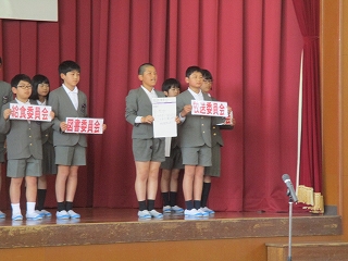 任命式では委員会の委員長、副委員長と、各学級の学級代表がこれからどんな事を頑張るかを述べていきました。