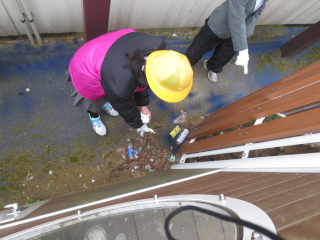 残念な雨。雨宿り中です。 代表の子を中心にゴミ拾い!遊具の下にもゴミがいっぱい。