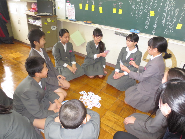 学校に帰ってきてから、3クラス合同でトランプで遊びました。卒業前に、また一つ楽しい