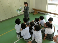 | ≪絵本の読み聞かせ≫ 6人の2年生がそれぞれ1冊ずつ、自分が選んだ絵本を読み聞かせしました。 真剣な面持ちで聞き入っている1年生。 本を好きになってくれるかなあ。 |
