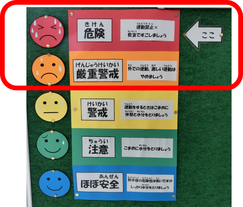学校の保健室前には、WBGT値から熱中症の危険度を知らせる掲示板があります。「危険」「厳重警戒」のレベルになったら、外で遊ぶのは避けた方がいいです。