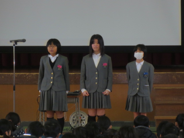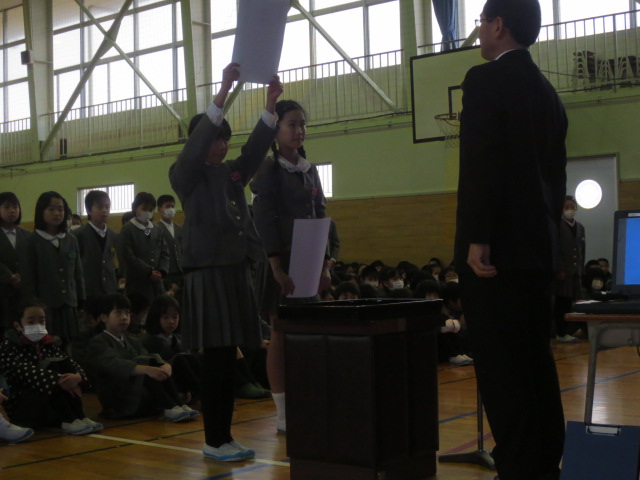 次に、今月の生活目標『感謝の気持ちを伝え合おう』について、生徒指導部の先生からお話がありました。毎日の生活の中で、いろんな方にお世話になっていること、その気持ちをしっかり伝えていきましょうというお話でした。2月27日には「6年生大感謝祭」が行われます。ありがとうでいっぱいの学校にしていけるといいですね。