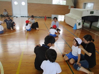 ドッチビーの前には、講師の先生が親子で楽しめる遊びを紹介してくれました。