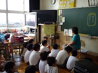 今日は、はまなす保育園、大根布保育園、白帆台保育園の年長さんが1年生と交流をしました。はまなす保育園の子どもたちは、暑い中、25分ほどかけて「入学したら歩かなければならないのですから・・・」と保育士さんと汗だくになって歩いて来ました。白帆台保育園の子どもたちは小学生が乗るスクールバスでやってきました。いつも保育園から眺めているバスに今日は乗ることができて喜んでいたそうです。